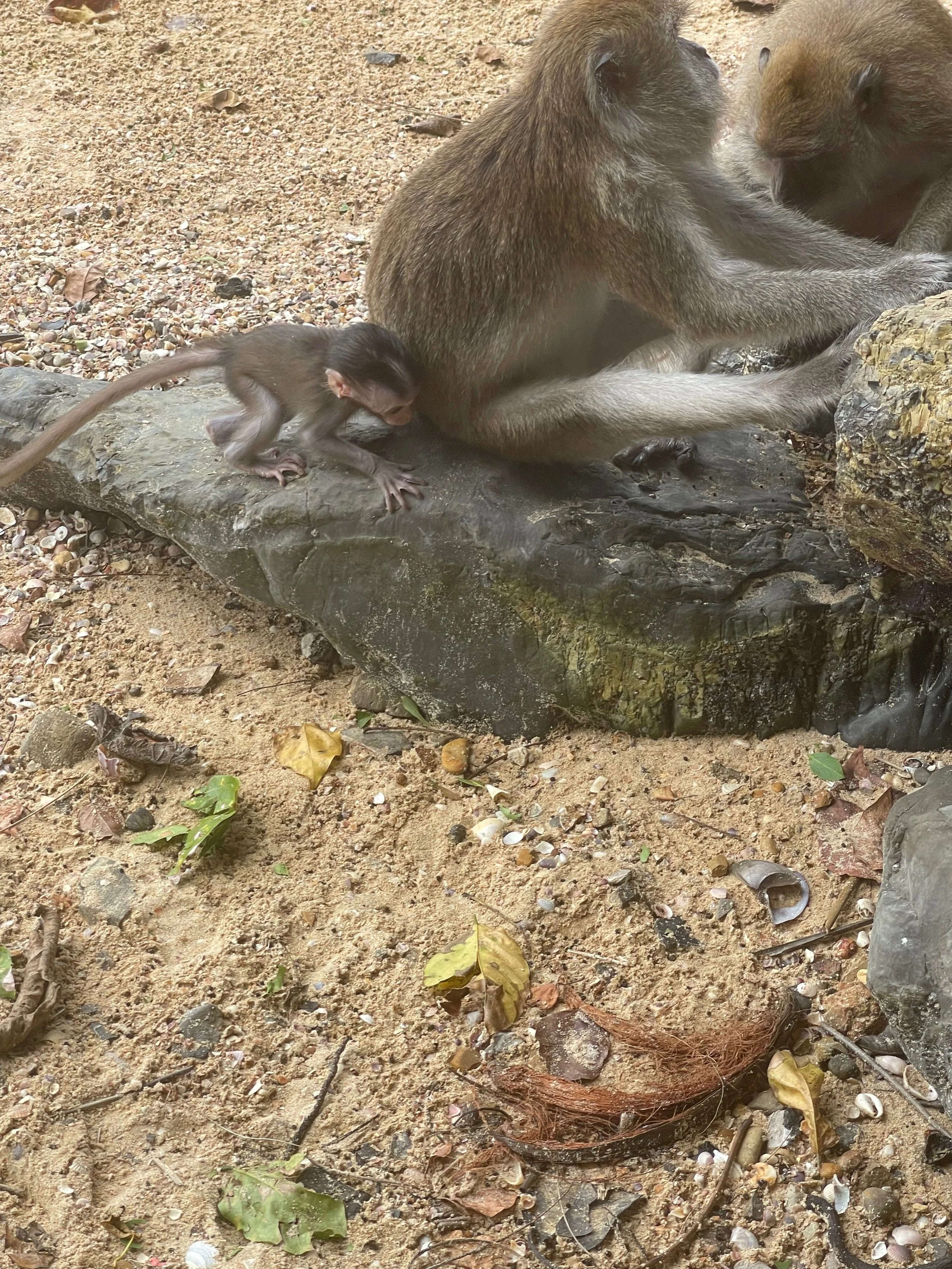 After shopping, we headed down to the beach and walked by all the long tail boats on shore on our way to the monkey trail at the other end of the beach. When we arrived to the monkey trail, there were macaque monkeys everywhere. The older ones were chilling, looking to see if anyone walking by had food, while the younger ones were wrestling and playing.
