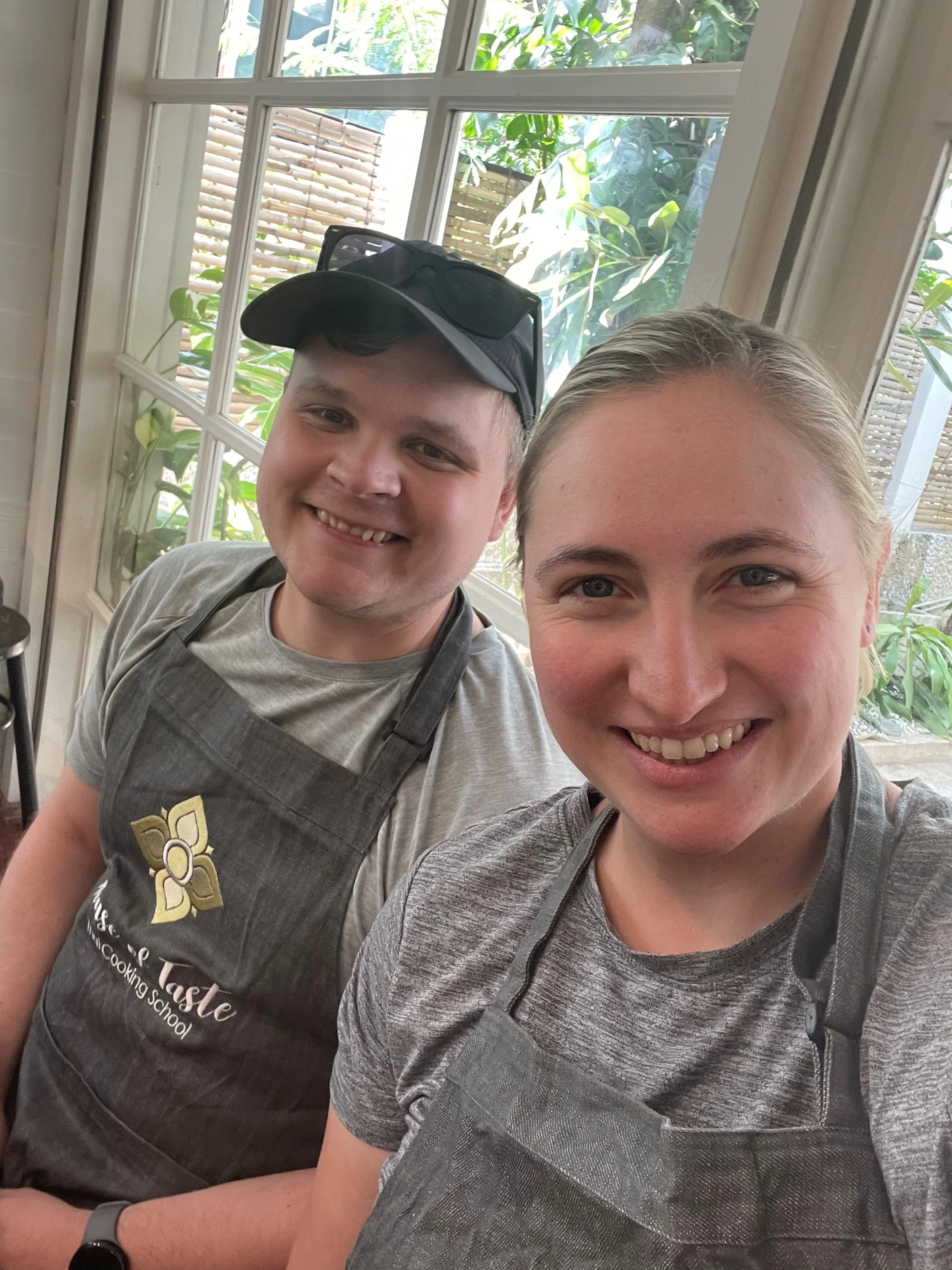 Lauren was also craving some tea, so we found a (again, bougie) tea shop in the same shopping mall and got some iced teas to go. While drinking our teas, we wandered around the mall and realized that it was outside of a very swanky hotel, so we wandered in to take a look and booked a Grab to take us to our cooking class.