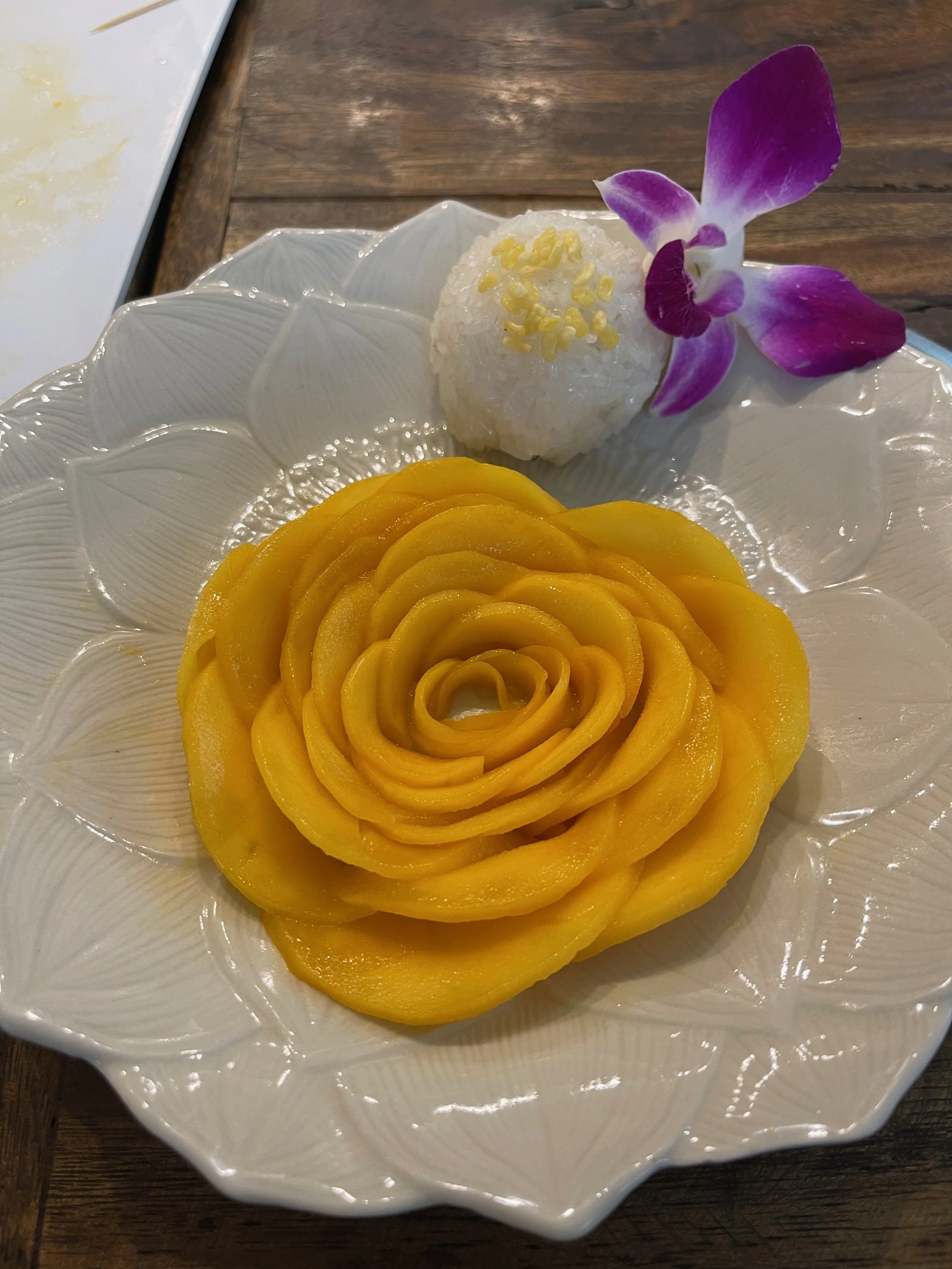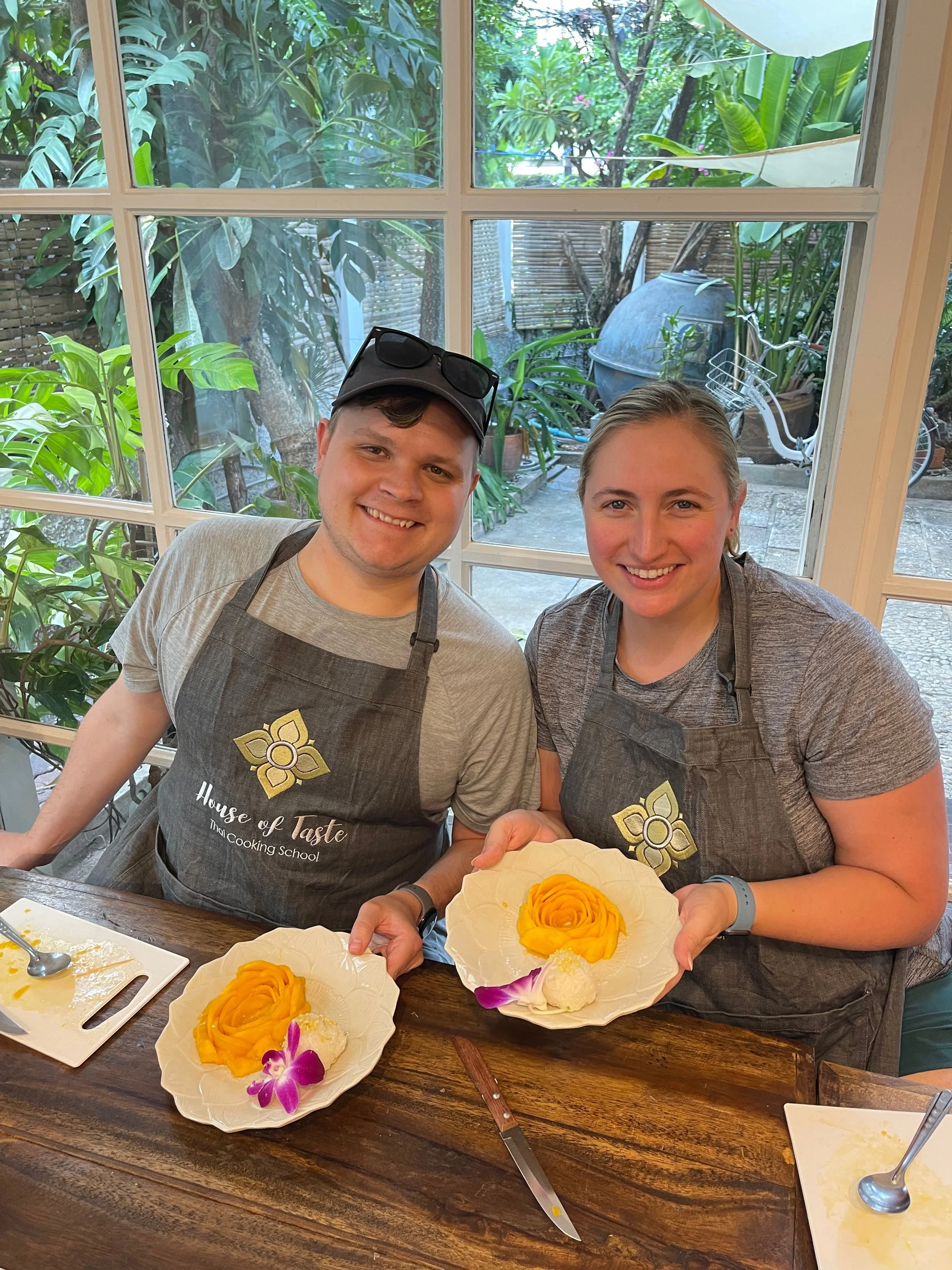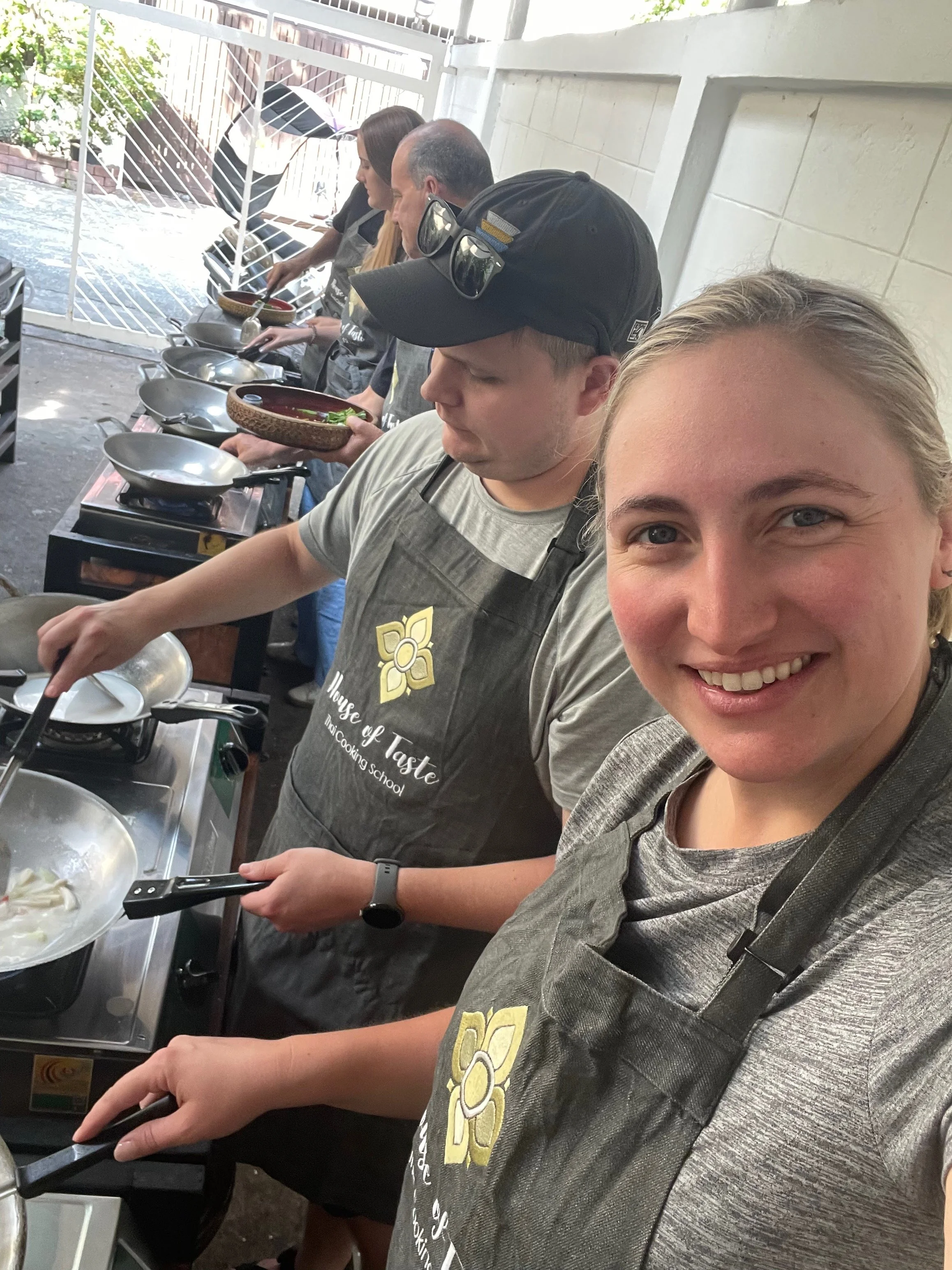 After learning about the ingredients, we would load up our bowls with everything we needed for each dish and then go outside to the stoves to cook them. After we threw everything into the woks, we would plate the dishes, then head back inside to enjoy. What we really liked was that, despite the peanuts we had to omit, everything was gluten and dairy free. We only used rice/rice noodles, coconut milk, fish sauce and tamarind sauce for our meals. Some of the interesting things we learned was that traditional Pad Thai is not meant to be spicy and that although curries in Thailand are inspired by India, many Thai people do not like the taste of Indian curries.