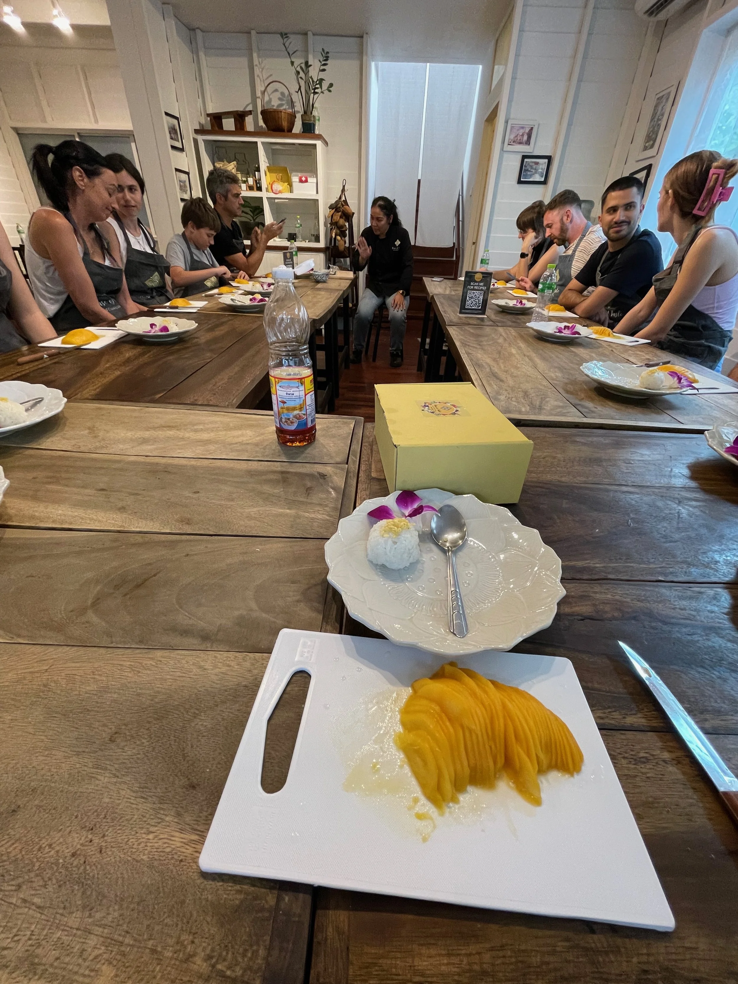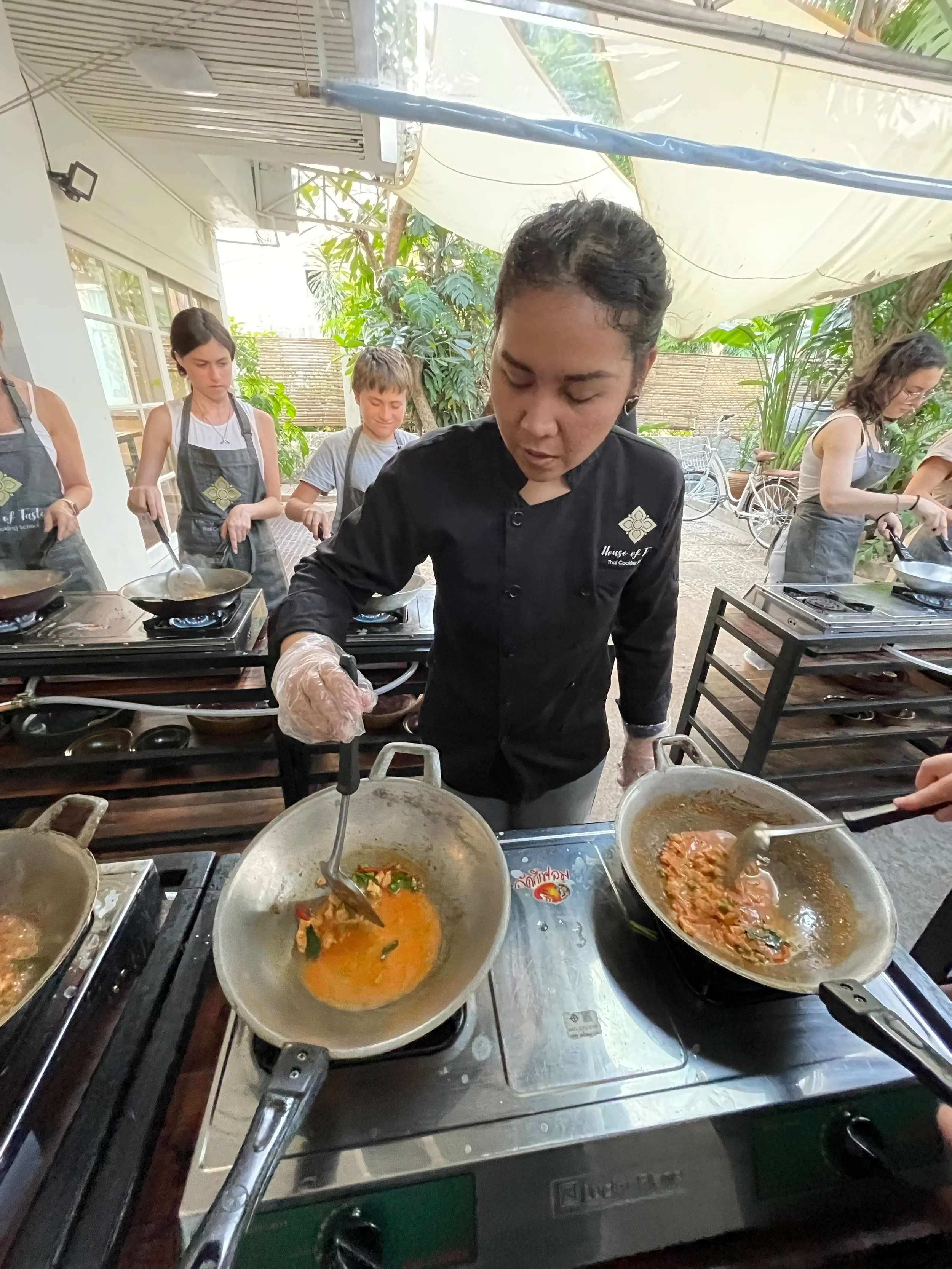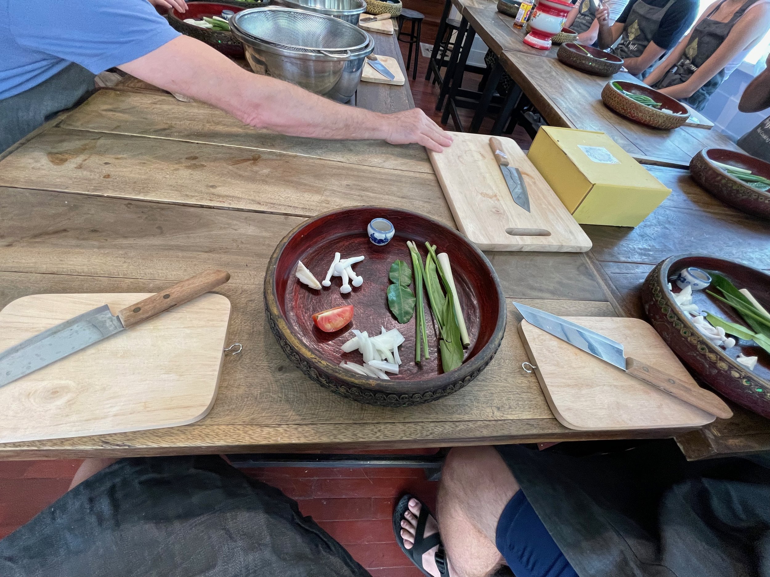 We pulled up to what looked like a private residence with a line of propane stoves on metal racks out front. We waited outside for a bit with while other guests arrived and then went inside in the A/C to wait for our instructor and her assistants to get everything ready.