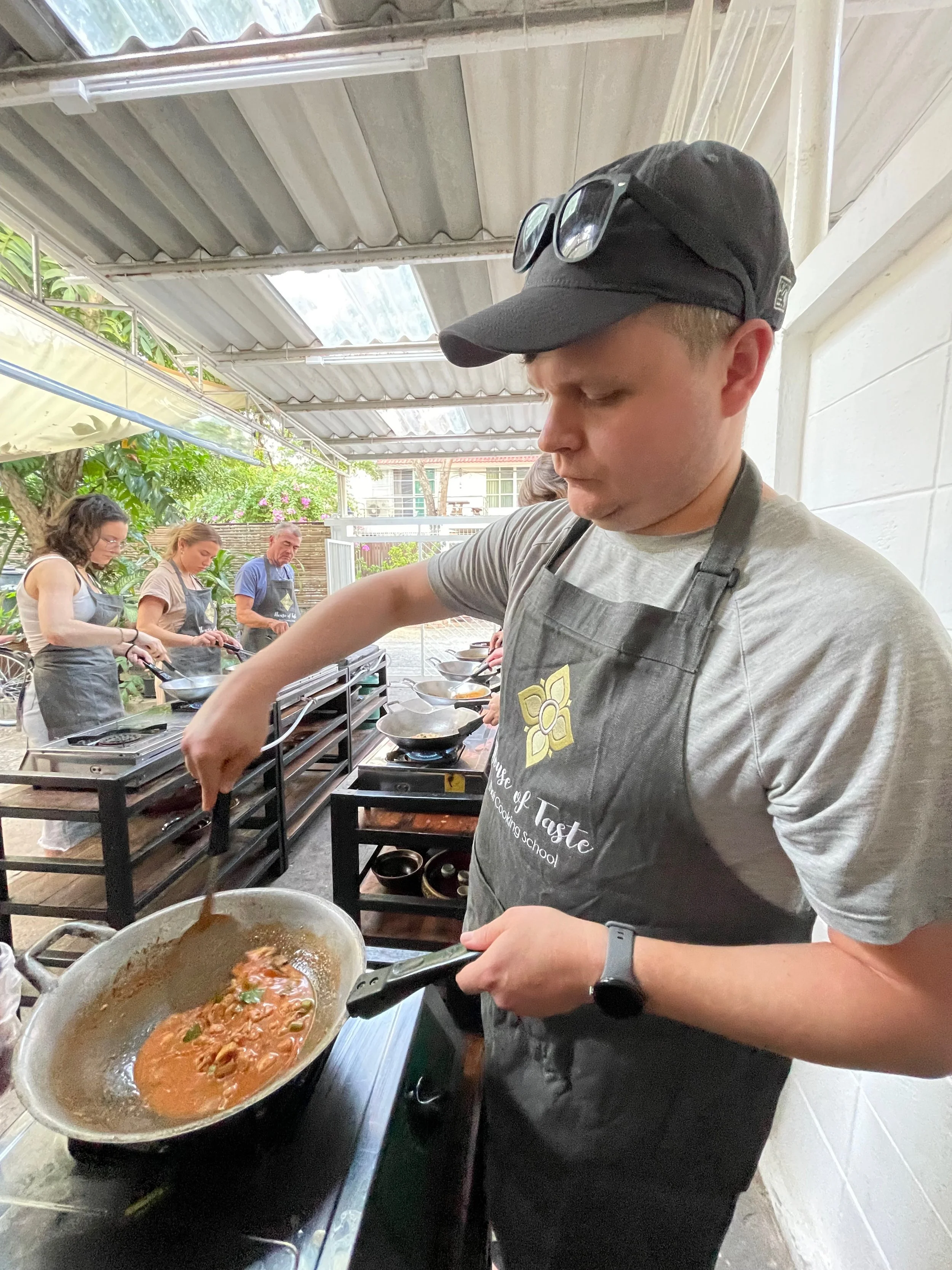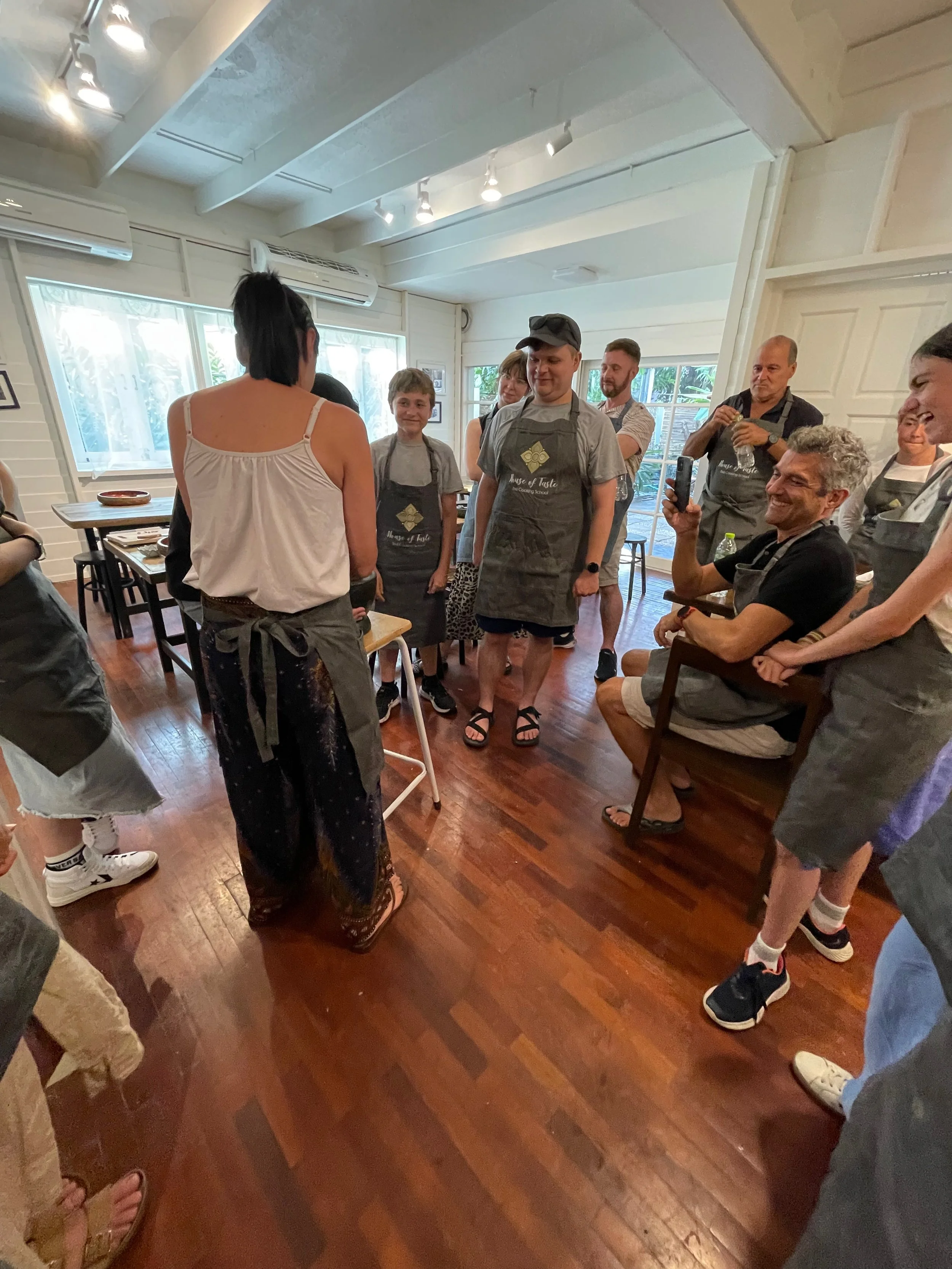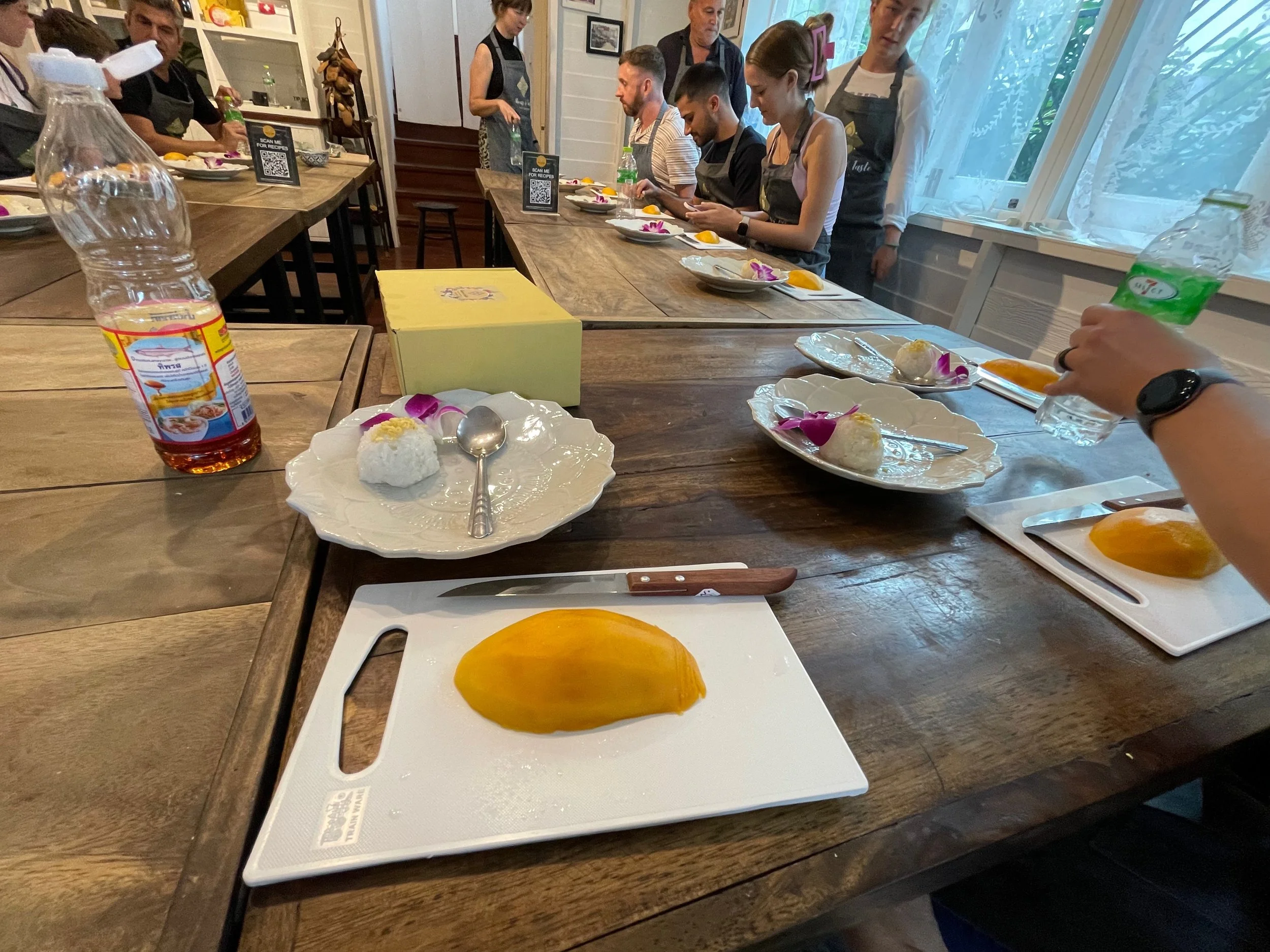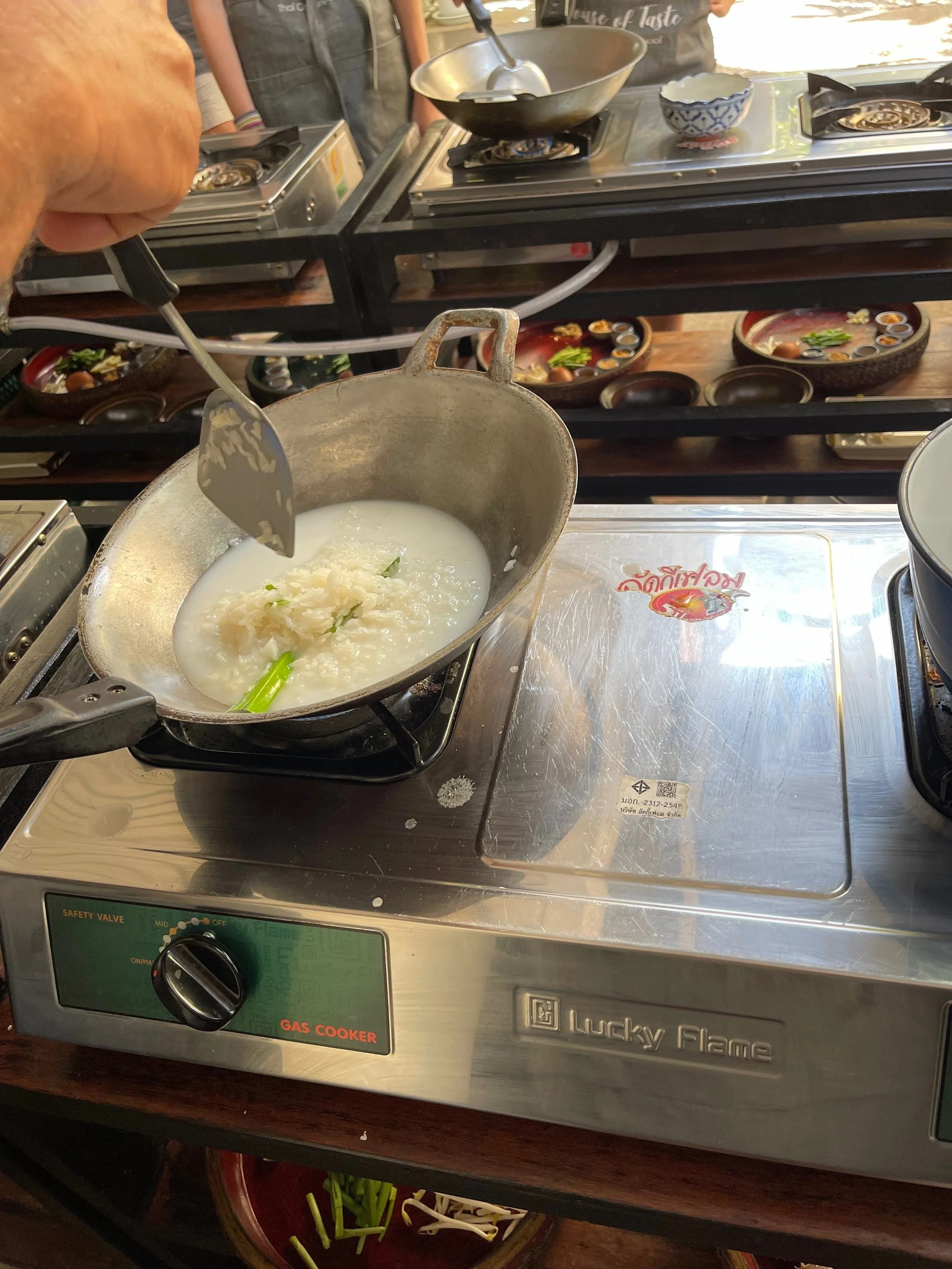 We pulled up to what looked like a private residence with a line of propane stoves on metal racks out front. We waited outside for a bit with while other guests arrived and then went inside in the A/C to wait for our instructor and her assistants to get everything ready.